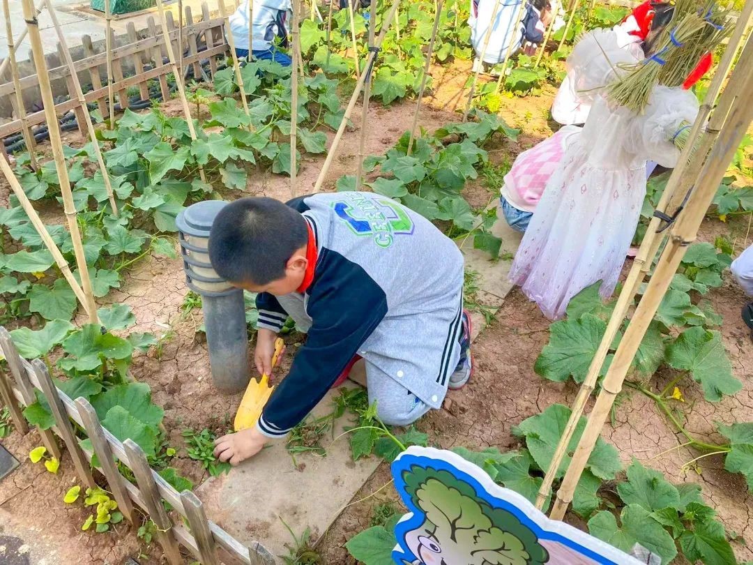 在这片丰饶的土地上,同学们认真浇灌着作物,轻轻挑拢着杂草。他们用手指轻轻碰触着田间的泥土,感受着阳光和微风。在老师的指导下,他们一遍遍地清理着田间杂草,让作物得到更多的养分和空气。除草不仅是一项繁琐的任务,也需要耐心和耐力。但是,同学们表现出了极高的热情和毅力,不畏艰苦、不怕脏累,一遍遍地扫除杂草,直至看到整洁美丽的农场。紧接着,他们一起在农场内安装稻草人,防止鸟类和其他小动物破坏庄稼。同学们制作稻草人的材料都是收集的废弃稻草和竹子,原本凌乱的材料,在他们的巧手下,变成了可爱的稻草人,为田间地头添上一丝生气和色彩。
