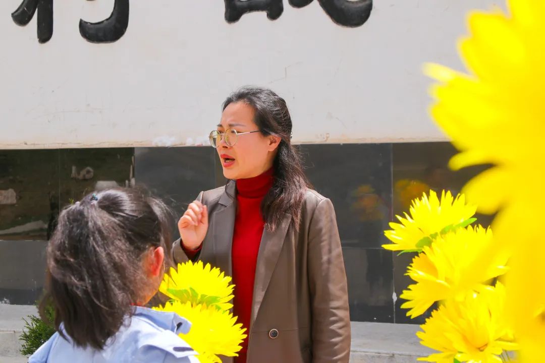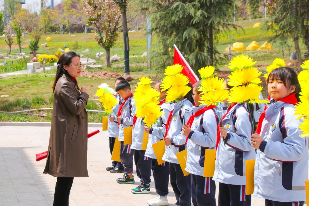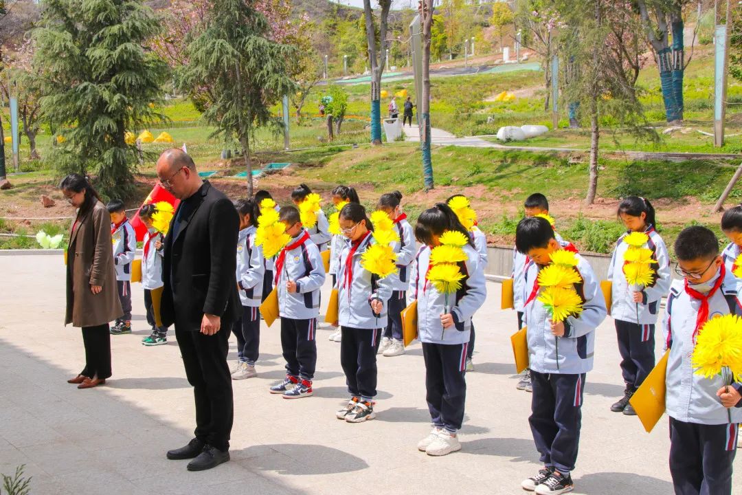 在庄严肃穆的纪念碑前,李主任和汪主任带领孩子们整齐列队,怀着无比崇敬的心情,肃立默哀,向牺牲的建设者们致敬,并依次将鲜花摆放在纪念碑前,深深鞠躬,表达对他们深切的缅怀和敬仰之情。