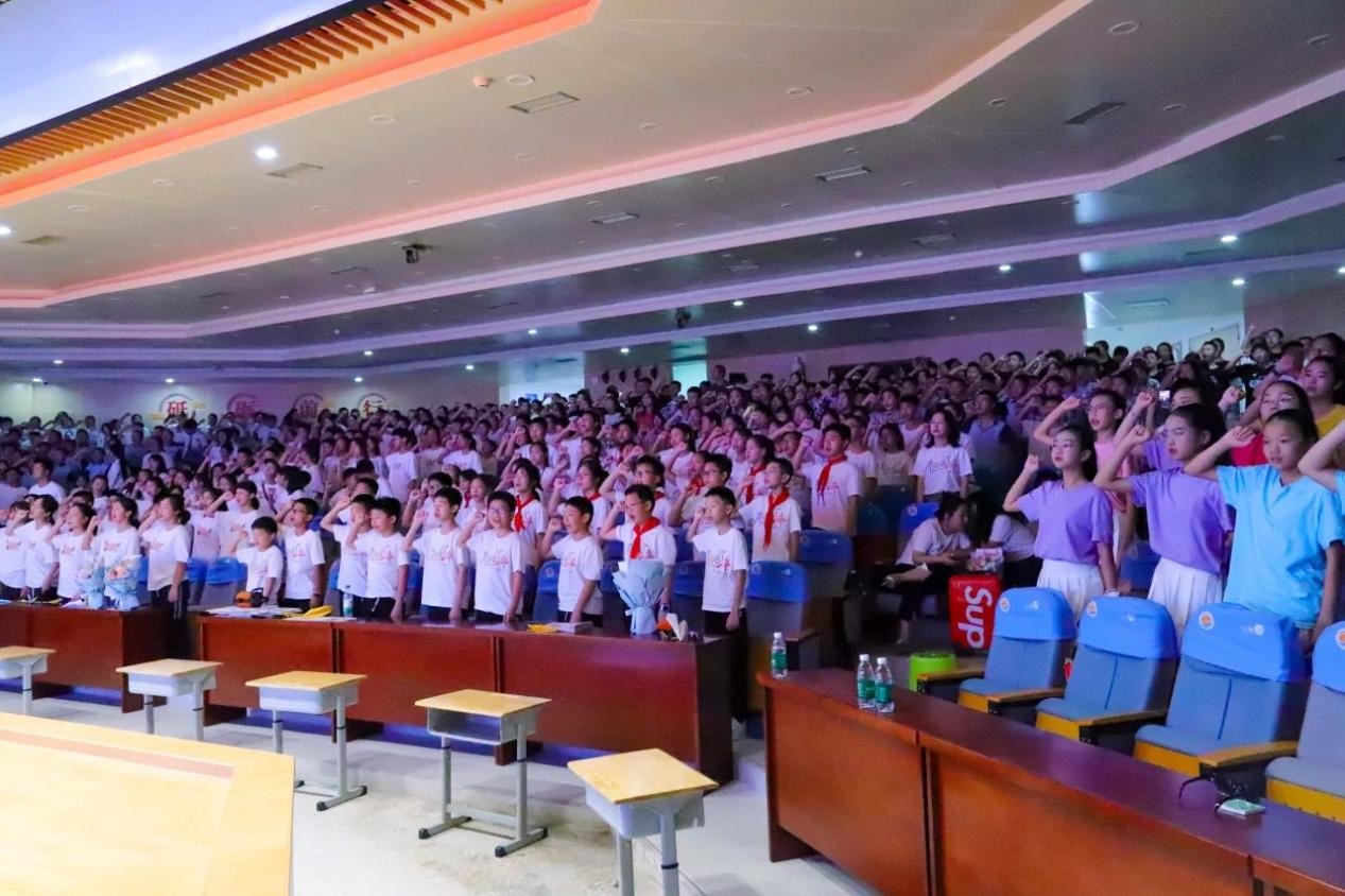 在这神圣时刻,全体同学庄严起立,举起右拳,进行小学阶段最后一次宣誓。